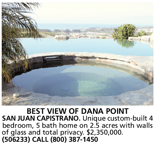 BEST VIEW OF DANA POINT SAN JUAN CAPISTRANO. Unique custom-built 4 bedroom, 5 bath home on 2.5 acres with walls of glass and total privacy. $2,350,000. (506233) CALL (800) 387-1450
