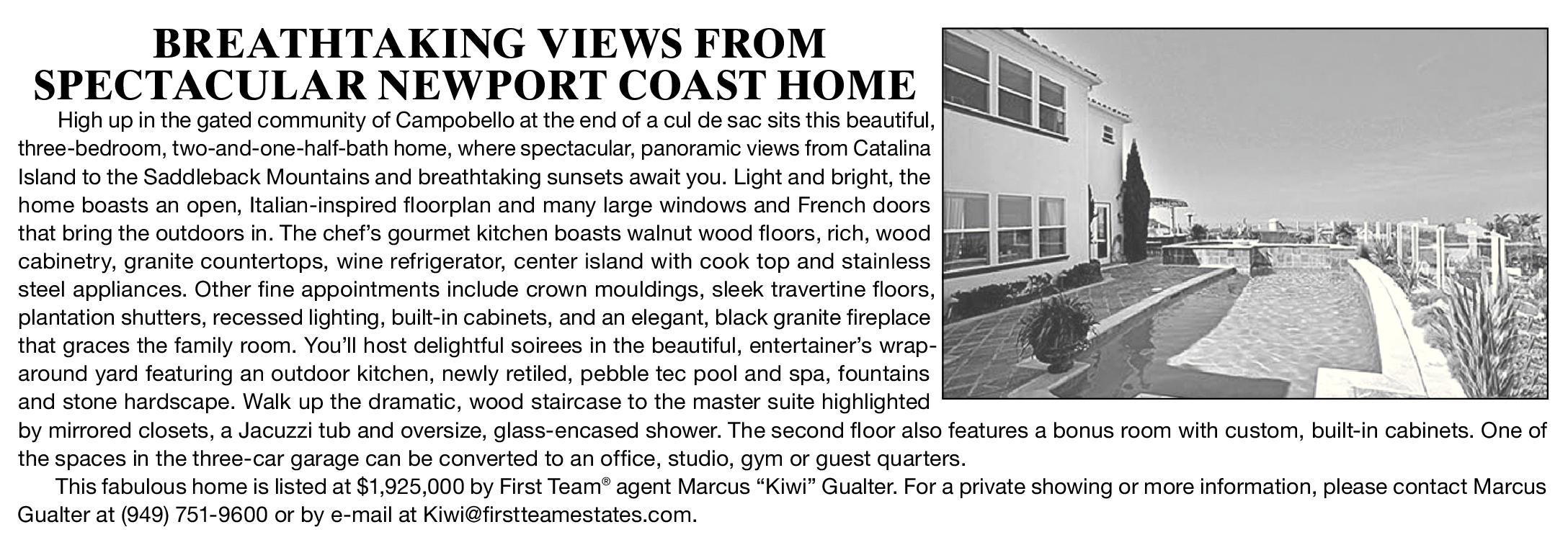 BREATHTAKING VIEWS FROM SPECTACULAR NEWPORT COAST HOME High up in the gated community of Campobello at the end of a cul de sac sits this beautiful, three-bedroom, two-and-one-half-bath home, where spectacular, panoramic views from Catalina Island to the Saddleback Mountains and breathtaking sunsets await you. Light and bright, the home boasts an open, Italian-inspired floorplan and many large windows and French doors that bring the outdoors in. The chef’s gourmet kitchen boasts walnut wood floors, rich, wood cabinetry, granite countertops, wine refrigerator, center island with cook top and stainless steel appliances. Other fine appointments include crown mouldings, sleek travertine fl oors, plantation shutters, recessed lighting, built-in cabinets, and an elegant, black granite fi replace that graces the family room. You’ll host delightful soirees in the beautiful, entertainer’s wraparound yard featuring an outdoor kitchen, newly retiled, pebble tec pool and spa, fountains and stone hardscape. Walk up the dramatic, wood staircase to the master suite highlighted by mirrored closets, a Jacuzzi tub and oversize, glass-encased shower. The second floor also features a bonus room with custom, built-in cabinets. One of the spaces in the three-car garage can be converted to an office, studio, gym or guest quarters. This fabulous home is listed at $1,925,000 by First Team ® agent Marcus “Kiwi” Gualter. For a private showing or more information, please contact Marcus Gualter at (949) 751-9600 or by e-mail at Kiwi@firstteamestates.com.
