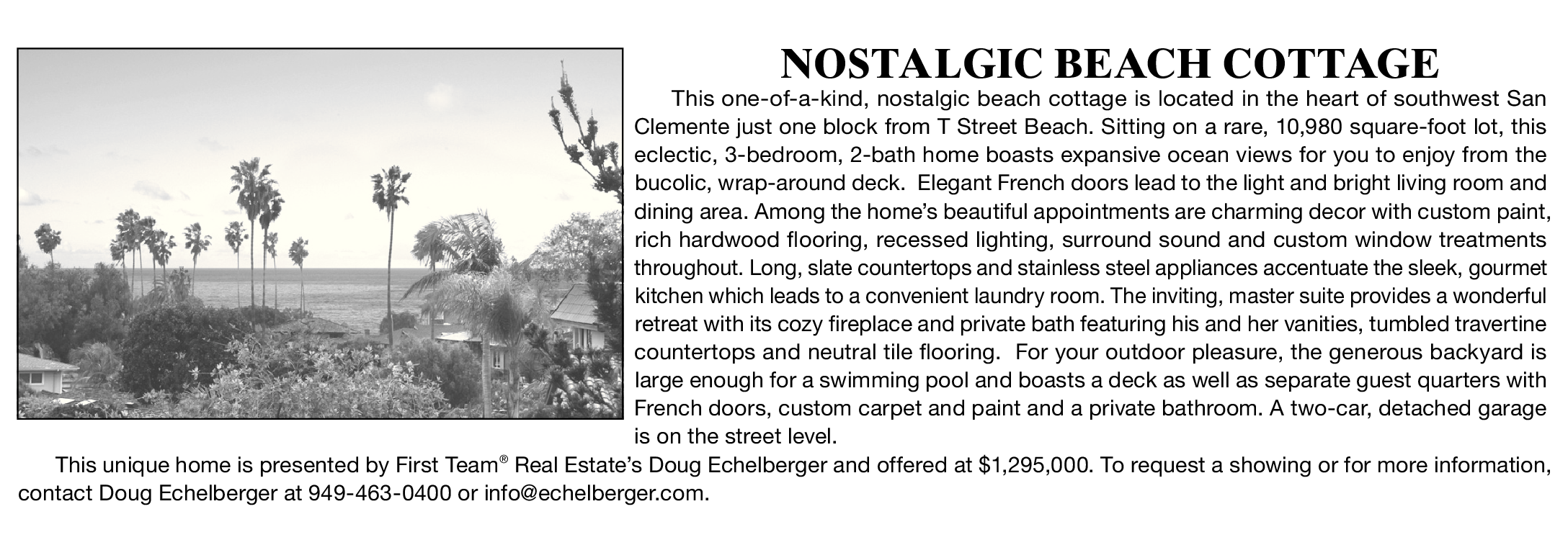 This unique home is presented by First Team ® Real Estate’s Doug Echelberger and offered at $1,295,000. To request a showing or for more information, contact Doug Echelberger at 949-463-0400 or info@echelberger.com.
