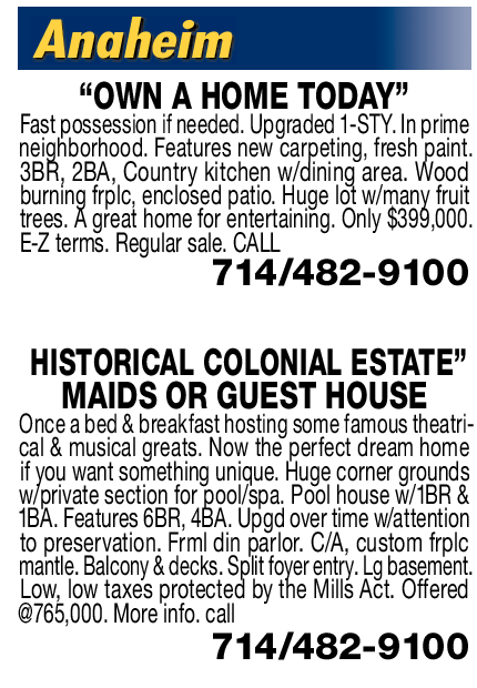 Anaheim “OWN A HOME TODAY” Fast possession if needed. Upgraded 1-STY. In prime neighborhood. Features new carpeting, fresh paint. 3BR, 2BA, Country kitchen w/dining area. Wood burning frplc, enclosed patio. Huge lot w/many fruit trees. A great home for entertaining. Only $399,000. E-Z terms. Regular sale. CALL 714/482-9100 HISTORICAL COLONIAL ESTATE” MAIDS OR GUEST HOUSE Once a bed & breakfast hosting some famous theatrical & musical greats. Now the perfect dream home if you want something unique. Huge corner grounds w/private section for pool/spa. Pool house w/1BR & 1BA. Features 6BR, 4BA. Upgd over time w/attention to preservation. Frml din parlor. C/A, custom frplc mantle. Balcony & decks. Split foyer entry. Lg basement. Low, low taxes protected by the Mills Act. Offered @765,000. More info. call 714/482-9100