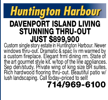 Huntington Harbour DAVENPORT ISLAND LIVING STUNNING THRU-OUT JUST $899,900 Custom single story estate in Huntington Harbour. Newer windows thru-out. Dramatic & spac liv rm warmed by a custom fireplace. Elegant frml dining rm. State of the art gourmet style kit. w/top of the line appliances. Sep den/study. Private wing of king size BR suites. Rich hardwood flooring thru-out. Beautiful patio w/ lush landscaping. Call today–priced to sell! 714/969-6100
