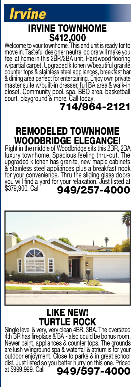 IRVINE TOWNHOME $412,000 Welcome to your townhome. This end unit is ready for to move in. Tasteful designer neutral colors will make you feel at home in this 2BR/2BA unit. Hardwood flooring w/partial carpet. Upgraded kitchen w/beautiful granite counter tops & stainless steel appliances, breakfast bar & dining area perfect for entertaining. Enjoy own private master suite w/built-in dresser, full BA area & walk-in closet. Community pool, spa, BBQ area, basketball court, playground & more. Call today!