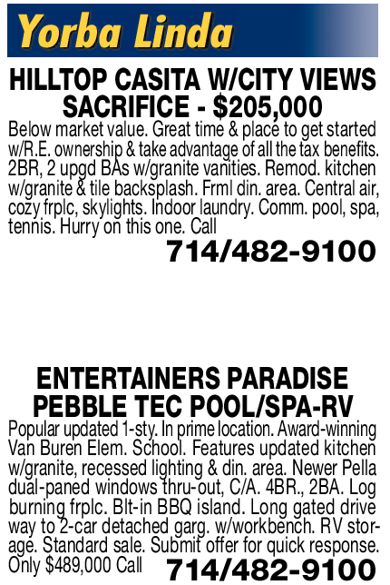 ENTERTAINERS PARADISE PEBBLE TEC POOL/SPA-RV Popular updated 1-sty. In prime location. Award-winning Van Buren Elem. School. Features updated kitchen w/granite, recessed lighting & din. area. Newer Pella dual-paned windows thru-out, C/A. 4BR., 2BA. Log burning frplc. Blt-in BBQ island. Long gated drive way to 2-car detached garg. w/workbench. R V storage. Standard sale. Submit offer for quick response. Only $489,000 Call 714/482-9100