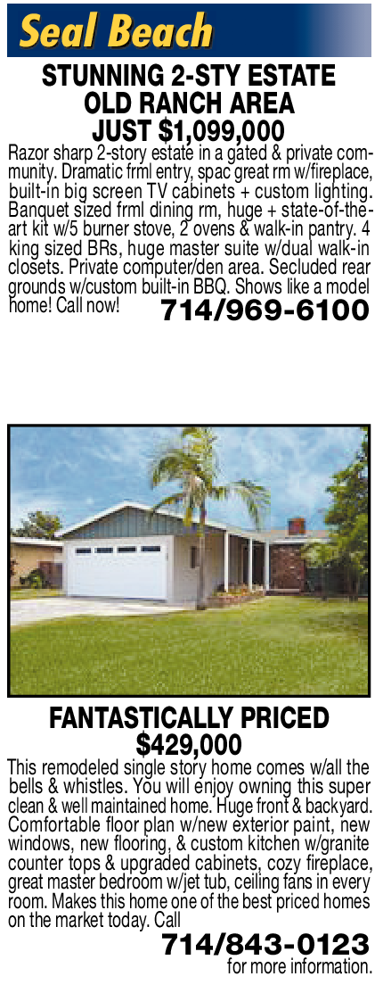 STUNNING 2-STY ESTATE OLD RANCH AREA JUST $1,099,000 Razor sharp 2-story estate in a gated & private community. Dramatic frml entry, spac great rm w/fireplace, built-in big screen TV cabinets + custom lighting. Banquet sized frml dining rm, huge + state-of-theart kit w/5 burner stove, 2 ovens & walk-in pantry. 4 frpl. king sized BRs, huge master suite w/dual walk-in grounds w/custom built-in BBQ. Shows like a model closets. Private computer/den area. Secluded rear home! Call now! 714/969-6100