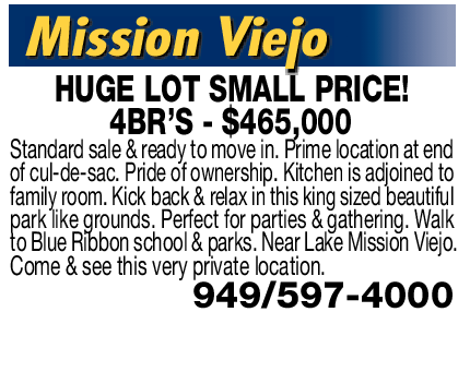 Mission Viejo HUGE LOT SMALL PRICE! 4BR’S - $465,000 Standard sale & ready to move in. Prime location at end of cul-de-sac. Pride of ownership. Kitchen is adjoined to family room. Kick back & relax in this king sized beautiful park like grounds. Perfect for parties & gathering. Walk to Blue Ribbon school & parks. Near Lake Mission Viejo. Come & see this very private location. 949/597-4000 See also