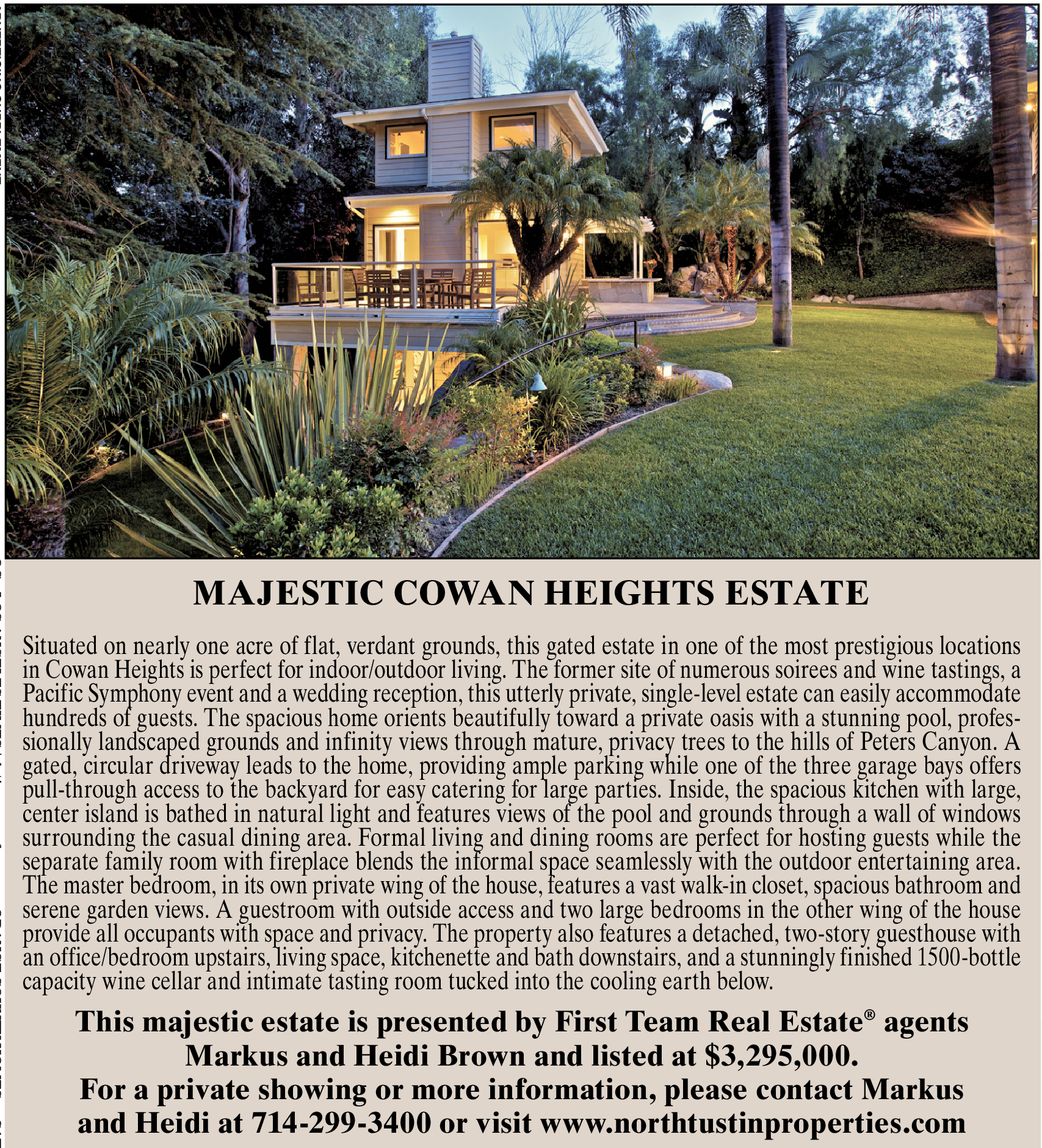 For a private showing or more information, please contact Markus and Heidi at 714-299-3400 or visit www.northtustinproperties.com