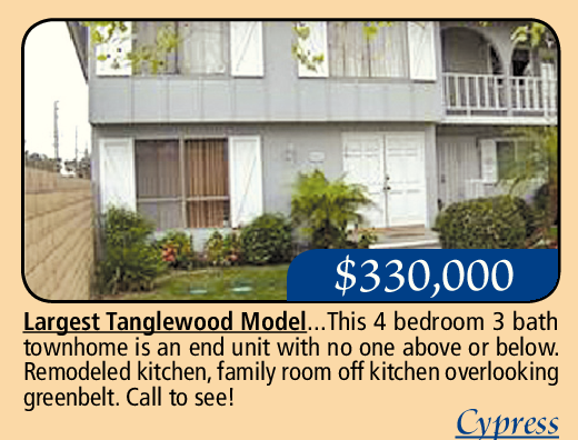 Largest Tanglewood Model...This 4 bedroom 3 bath townhome is an end unit with no one above or below. Remodeled kitchen, family room off kitchen overlooking greenbelt. Call to see!