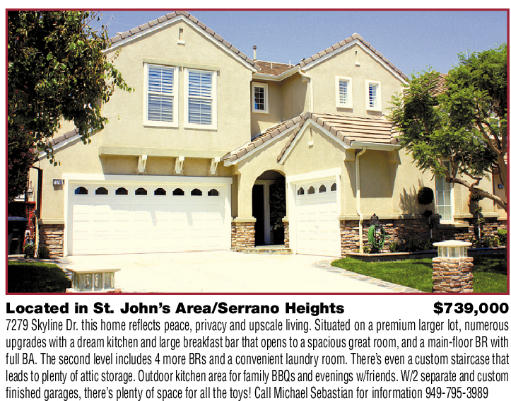 Located in St. John’s Area/Serrano Heights $739,000 7279 Skyline Dr. this home reflects peace, privacy and upscale living. Situated on a premium larger lot, numerous upgrades with a dream kitchen and large breakfast bar that opens to a spacious great room, and a main-floor BR with full BA. The second level includes 4 more BRs and a convenient laundry room. There’s even a custom staircase that leads to plenty of attic storage. Outdoor kitchen area for family BBQs and evenings w/friends. W/2 separate and custom finished garages, there’s plenty of space for all the toys! Call Michael Sebastian for information 949-795-3989
