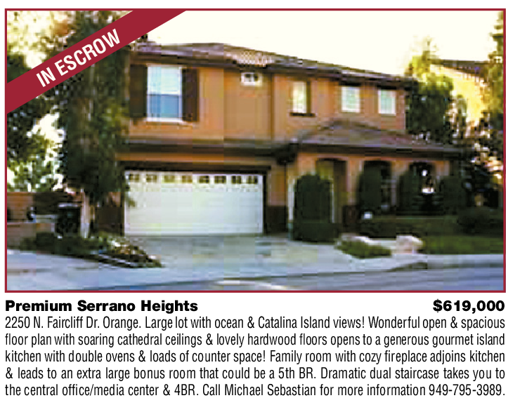 Premium Serrano Heights $619,000 2250 N. Faircliff Dr. Orange. Large lot with ocean & Catalina Island views! Wonderful open & spacious floor plan with soaring cathedral ceilings & lovely hardwood floors opens to a generous gourmet island kitchen with double ovens & loads of counter space! Family room with cozy fireplace adjoins kitchen & leads to an extra large bonus room that could be a 5th BR. Dramatic dual staircase takes you to the central offi ce/media center & 4BR. Call Michael Sebastian for more information 949-795-3989.