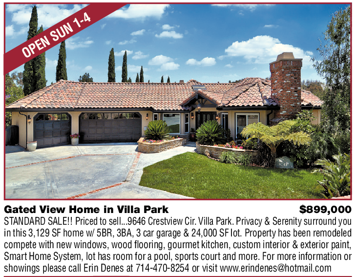 Gated View Home in Villa Park $899,000 STANDARD SALE!! Priced to sell...9646 Crestview Cir. Villa Park. Privacy & Serenity surround you in this 3,129 SF home w/ 5BR, 3BA, 3 car garage & 24,000 SF lot. Property has been remodeled compete with new windows, wood flooring, gourmet kitchen, custom interior & exterior paint, Smart Home System, lot has room for a pool, sports court and more. For more information or showings please call Erin Denes at 714-470-8254 or visit www.erindenes@hotmail.com