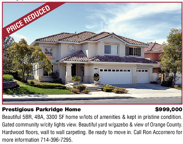 kitchen overlooking showings please call Erin Denes at 714-470-8254 or visit www.erindenes@hotmail.com Prestigious Parkridge Home $999,000 Beautiful 5BR, 4BA, 3300 SF home w/lots of amenities & kept in pristine condition. Gated community w/city lights view. Beautiful yard w/gazebo & view of Orange County. Hardwood floors, wall to wall carpeting. Be ready to move in. Call Ron Accornero for more information 714-396-7295.