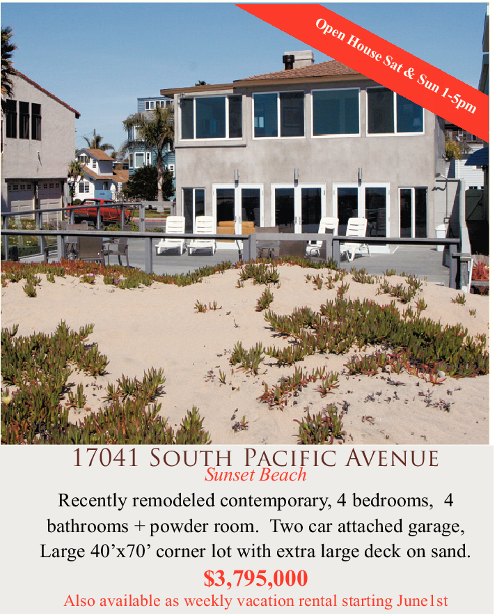 Sunset Beach Recently remodeled contemporary, 4 bedrooms, 4 bathrooms + powder room. Two car attached garage, Large 40’x70’ corner lot with extra large deck on sand.