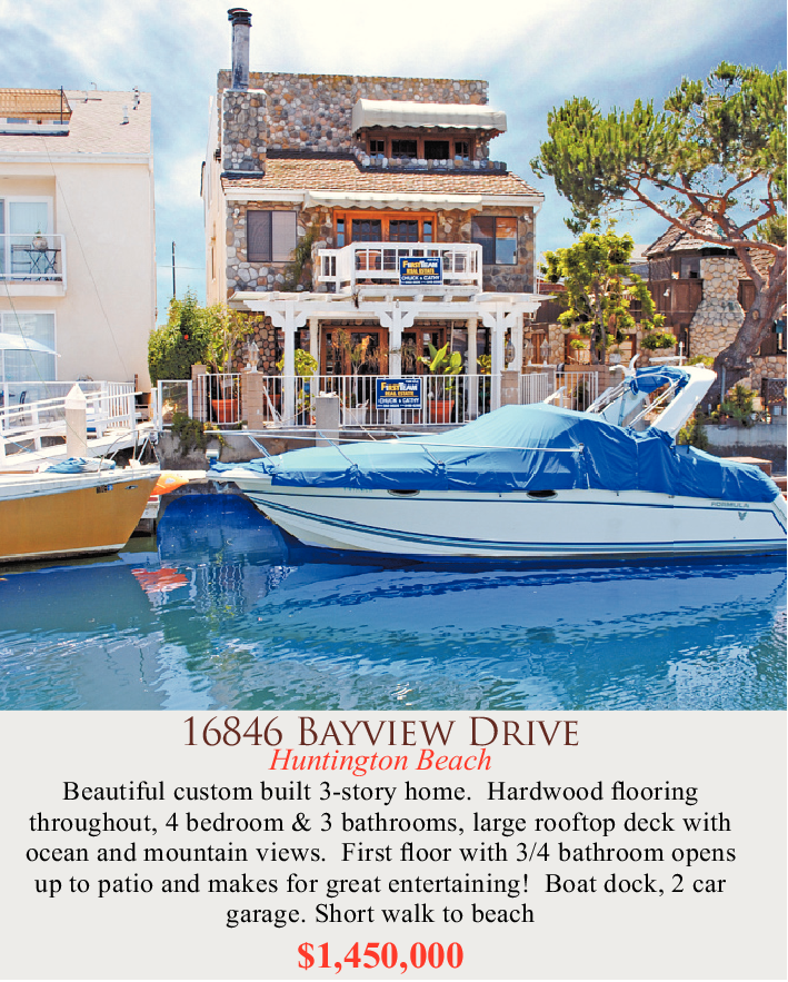 16846 Bayview Drive Huntington Beach Beautiful custom built 3-story home. Hardwood flooring throughout, 4 bedroom & 3 bathrooms, large rooftop deck with ocean and mountain views. First floor with 3/4 bathroom opens up to patio and makes for great entertaining! Boat dock, 2 car garage. Short walk to beach $1,450,000