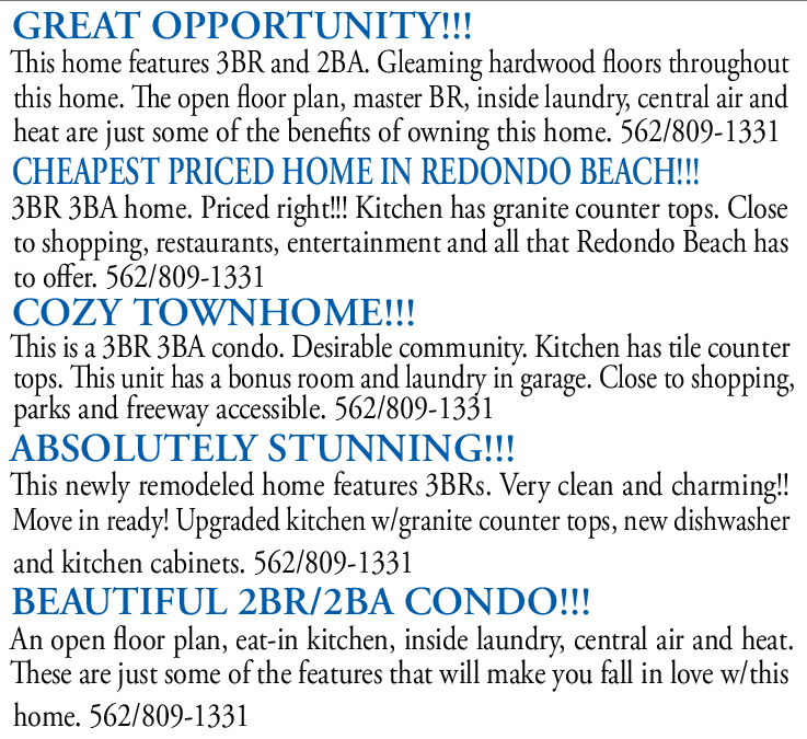 GREAT OPPORTUNITY!!! This home features 3BR and 2BA. Gleaming hardwood floors throughout this home. The open floor plan, master BR, inside laundry, central air and heat are just some of the benefits of owning this home. 562/809-1331 CHEAPEST PRICED HOME IN REDONDO BEACH!!! 3BR 3BA home. Priced right!!! Kitchen has granite counter tops. Close to shopping, restaurants, entertainment and all that Redondo Beach has to offer. 562/809-1331 COZY TOWNHOME!!! This is a 3BR 3BA condo. Desirable community. Kitchen has tile counter tops. This unit has a bonus room and laundry in garage. Close to shopping, parks and freeway accessible. 562/809-1331 ABSOLUTELY STUNNING!!! This newly remodeled home features 3BRs. Very clean and charming!! Move in ready! Upgraded kitchen w/granite counter tops, new dishwasher and kitchen cabinets. 562/809-1331 BEAUTIFUL 2BR/2BA CONDO!!! An open floor plan, eat-in kitchen, inside laundry, central air and heat. These are just some of the features that will make you fall in love w/this home. 562/809-1331