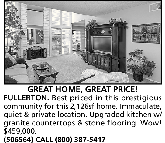 FULLERTON. Best priced in this prestigious community for this 2,126sf home. Immaculate, quiet & private location. Upgraded kitchen w/ granite countertops & stone flooring. Wow! $459,000. (506564) CALL (800) 387-5417