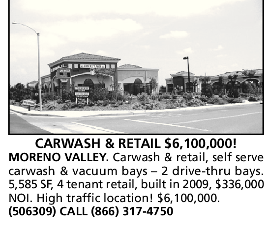 MORENO VALLEY. Carwash & retail, self serve carwash & vacuum bays – 2 drive-thru bays. 5,585 SF, 4 tenant retail, built in 2009, $336,000 NOI. High traffic location! $6,100,000. (506309) CALL (866) 317-4750