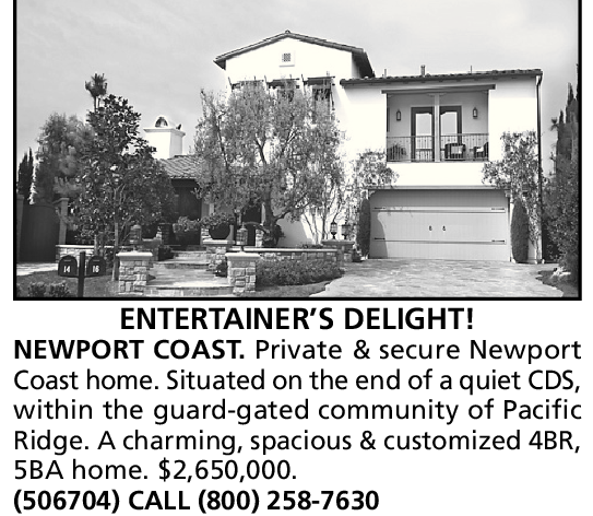 ENTERTAINER’S DELIGHT! NEWPORT COAST. Private & secure Newport Coast home. Situated on the end of a quiet CDS, within the guard-gated community of Pacific Ridge. A charming, spacious & customized 4BR, 5BA home. $2,650,000. (506704) CALL (800) 258-7630