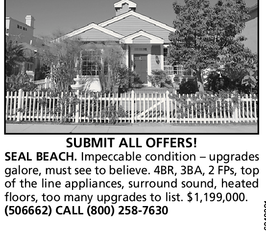 SEAL BEACH. Impeccable condition – upgrades galore, must see to believe. 4BR, 3BA, 2 FPs, top of the line appliances, surround sound, heated floors, too many upgrades to list. $1,199,000. (506662) CALL (800) 258-7630