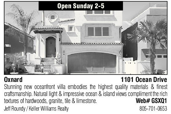 Oxnard 1101 Ocean Drive Stunning new oceanfront villa embodies the highest quality materials & finest craftsmanship. Natural light & impressive ocean & island views compliment the rich textures of hardwoods, granite, tile & limestone. Web# GSXQ1 Jeff Roundy / Keller Williams Realty 805-701-0653