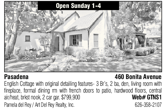 Open Sunday 1-4 Pasadena 460 Bonita Avenue English Cottage with original detailing features- 3 Br’s, 2 ba, den, living room with fireplace, formal dining rm with french doors to patio, hardwood floors, central air/heat, brkst nook, 2 car gar. $799,900 Web# GTNS1 Pamela del Rey / Art Del Rey Realty, Inc. 626-358-2107 See also