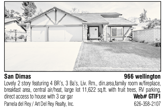 San Dimas 966 wellington Lovely 2 story featuring 4 BR’s, 3 Ba’s, Liv. Rm., din.area,family room w/fireplace, breakfast area, central air/heat, large lot 11,622 sq.ft. with fruit trees, RV parking, direct access to house with 3 car gar Web# GTIF1 Pamela del Rey / Art Del Rey Realty, Inc. 626-358-2107