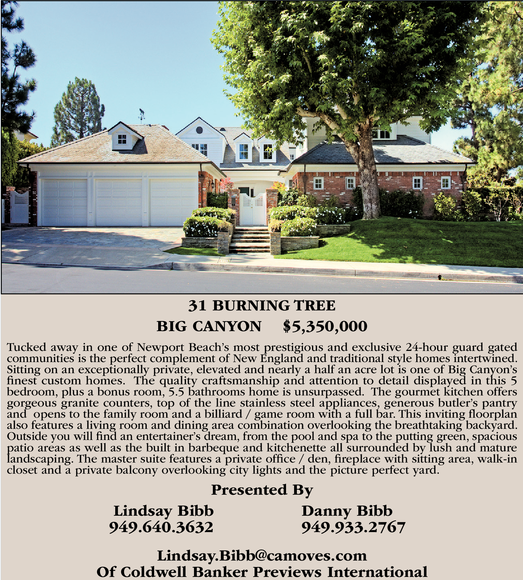 31 BURNING TREE BIG CANYON $5,350,000 Tucked away in one of Newport Beach’s most prestigious and exclusive 24-hour guard gated communities is the perfect complement of New England and traditional style homes intertwined. Sitting on an exceptionally private, elevated and nearly a half an acre lot is one of Big Canyon’s finest custom homes. The quality craftsmanship and attention to detail displayed in this 5 bedroom, plus a bonus room, 5.5 bathrooms home is unsurpassed. The gourmet kitchen offers gorgeous granite counters, top of the line stainless steel appliances, generous butler’s pantry and opens to the family room and a billiard / game room with a full bar. This inviting floorplan also features a living room and dining area combination overlooking the breathtaking backyard. Outside you will find an entertainer’s dream, from the pool and spa to the putting green, spacious patio areas as well as the built in barbeque and kitchenette all surrounded by lush and mature landscaping. The master suite features a private office / den, fireplace with sitting area, walk-in closet and a private balcony overlooking city lights and the picture perfect yard. Presented By Lindsay Bibb Danny Bibb 949.640.3632 949.933.2767 Lindsay.Bibb@camoves.com Of Coldwell Banker Previews International