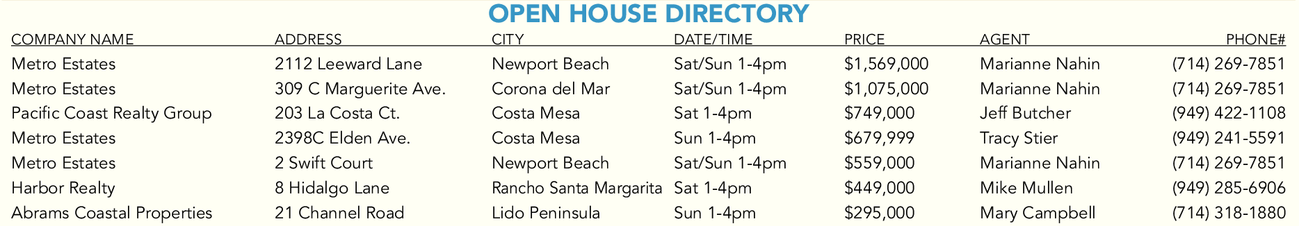Metro Estates 2112 Leeward Lane Newport Beach Sat/Sun 1-4pm $1,569,000 Marianne Nahin (714) 269-7851 Metro Estates 309 C Marguerite Ave. Corona del Mar Sat/Sun 1-4pm $1,075,000 Marianne Nahin (714) 269-7851 Pacific Coast Realty Group 203 La Costa Ct. Costa Mesa Sat 1-4pm $749,000 Jeff Butcher (949) 422-1108 Metro Estates 2398C Elden Ave. Costa Mesa Sun 1-4pm $679,999 Tracy Stier (949) 241-5591 Metro Estates 2 Swift Court Newport Beach Sat/Sun 1-4pm $559,000 Marianne Nahin (714) 269-7851 Harbor Realty 8 Hidalgo Lane Rancho Santa Margarita Sat 1-4pm $449,000 Mike Mullen (949) 285-6906 Abrams Coastal Properties 21 Channel Road Lido Peninsula Sun 1-4pm $295,000 Mary Campbell (714) 318-1880