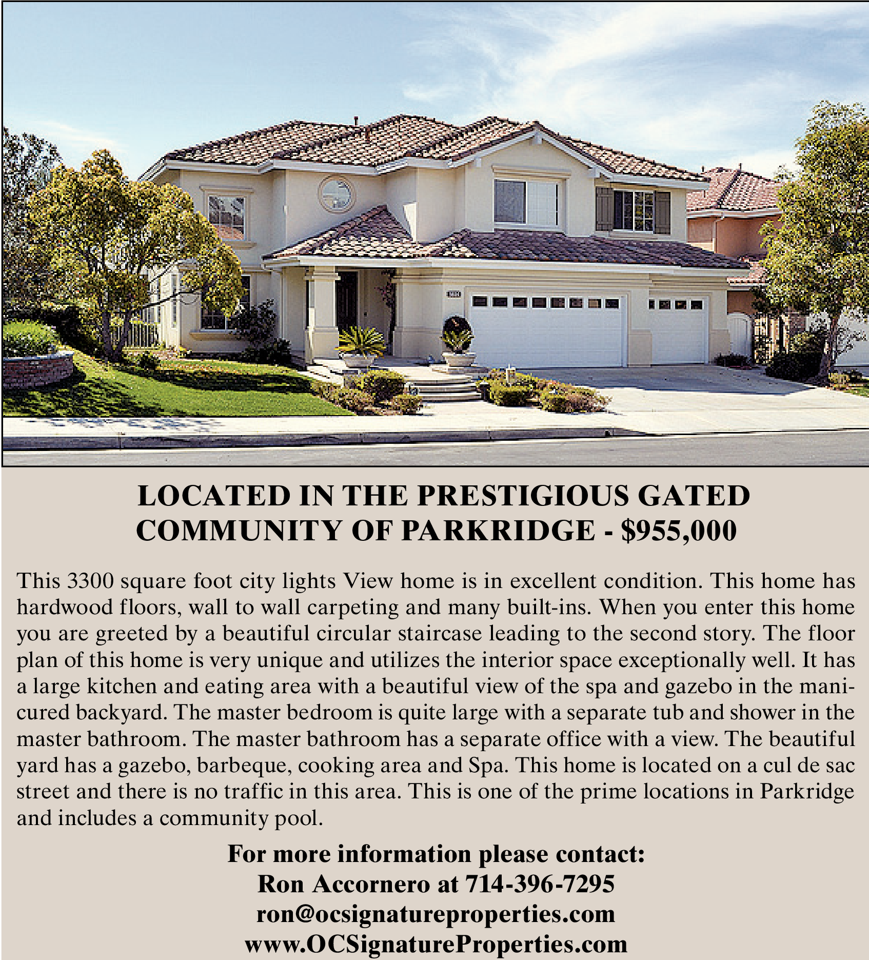 LOCATED IN THE PRESTIGIOUS GATED COMMUNITY OF PARKRIDGE - $955,000 This 3300 square foot city lights View home is in excellent condition. This home has hardwood floors, wall to wall carpeting and many built-ins. When you enter this home you are greeted by a beautiful circular staircase leading to the second story. The floor plan of this home is very unique and utilizes the interior space exceptionally well. It has a large kitchen and eating area with a beautiful view of the spa and gazebo in the manicured backyard. The master bedroom is quite large with a separate tub and shower in the master bathroom. The master bathroom has a separate office with a view. The beautiful yard has a gazebo, barbeque, cooking area and Spa. This home is located on a cul de sac street and there is no traffic in this area. This is one of the prime locations in Parkridge and includes a community pool. For more information please contact: Ron Accornero at 714-396-7295 ron@ocsignatureproperties.com www.OCSignatureProperties.com