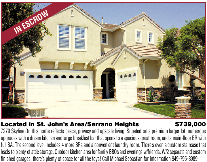 Located in St. John’s Area/Serrano Heights $739,000 7279 Skyline Dr. this home reflects peace, privacy and upscale living. Situated on a premium larger lot, numerous upgrades with a dream kitchen and large breakfast bar that opens to a spacious great room, and a main-floor BR with full BA. The second level includes 4 more BRs and a convenient laundry room. There’s even a custom staircase that leads to plenty of attic storage. Outdoor kitchen area for family BBQs and evenings w/friends. W/2 separate and custom finished garages, there’s plenty of space for all the toys! Call Michael Sebastian for information 949-795-3989