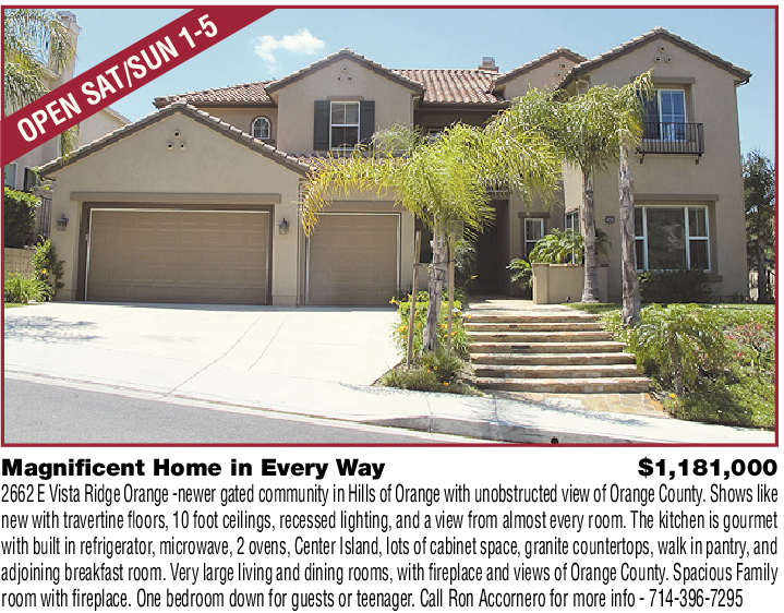 Magnificent Home in Every Way $1,181,000 2662 E Vista Ridge Orange -newer gated community in Hills of Orange with unobstructed view of Orange County. Shows like new with travertine floors, 10 foot ceilings, recessed lighting, and a view from almost every room. The kitchen is gourmet with built in refrigerator, microwave, 2 ovens, Center Island, lots of cabinet space, granite countertops, walk in pantry, and adjoining breakfast room. Very large living and dining rooms, with fireplace and views of Orange County. Spacious Family room with fi replace. One bedroom down for guests or teenager. Call Ron Accornero for more info - 714-396-7295