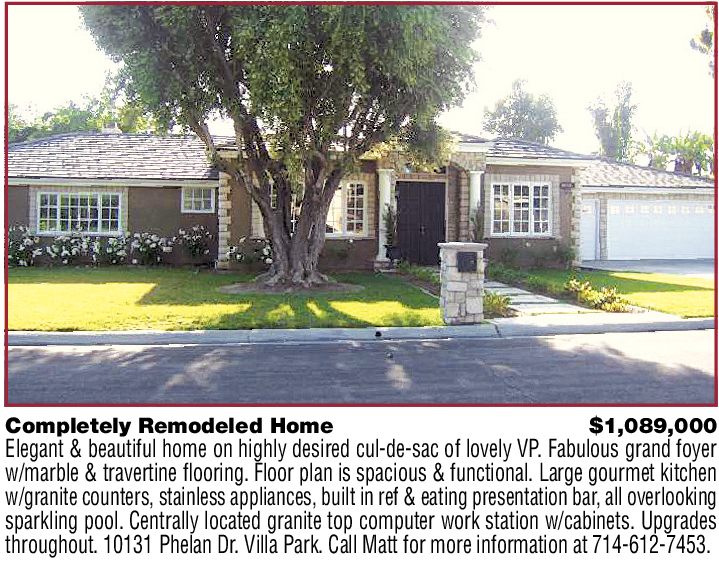Completely Remodeled Home $1,089,000 Elegant & beautiful home on highly desired cul-de-sac of lovely VP. Fabulous grand foyer w/marble & travertine flooring. Floor plan is spacious & functional. Large gourmet kitchen w/granite counters, stainless appliances, built in ref & eating presentation bar, all overlooking sparkling pool. Centrally located granite top computer work station w/cabinets. Upgrades throughout. 10131 Phelan Dr. Villa Park. Call Matt for more information at 714-612-7453.