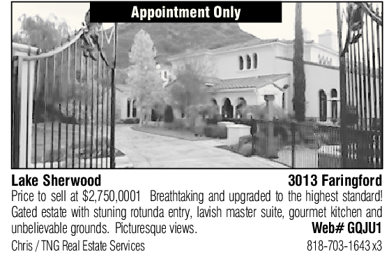 Lake Sherwood 3013 Faringford Price to sell at $2,750,0001 Breathtaking and upgraded to the highest standard! unbelievable grounds. Picturesque views. Web# GQJU1 Gated estate with stuning rotunda entry, lavish master suite, gourmet kitchen and Chris / TNG Real Estate Services 818-703-1643 x3