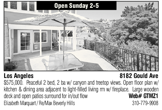Los Angeles 8182 Gould Ave $575,000. Peaceful 2 bed, 2 ba w/ canyon and treetop views. Open floor plan w/ kitchen & dining area adjacent to light-filled living rm w/ fireplace. Large wooden deck and open patios surround for in/out flow Web# GTMZ1 Elizabeth Marquart / Re/Max Beverly Hills 310-779-9908