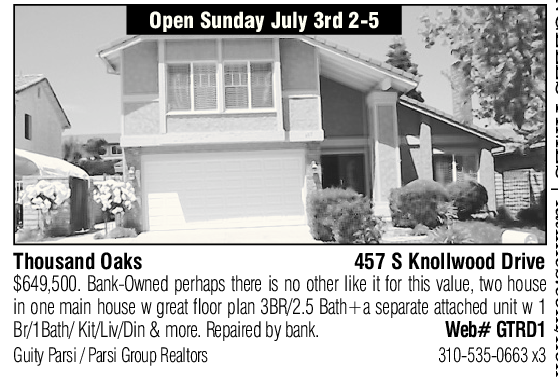 Thousand Oaks 457 S Knollwood Drive $649,500. Bank-Owned perhaps there is no other like it for this value, two house in one main house w great floor plan 3BR/2.5 Bath+a separate attached unit w 1 Br/1Bath/ Kit/Liv/Din & more. Repaired by bank. Web# GTRD1 Guity Parsi / Parsi Group Realtors 310-535-0663 x3