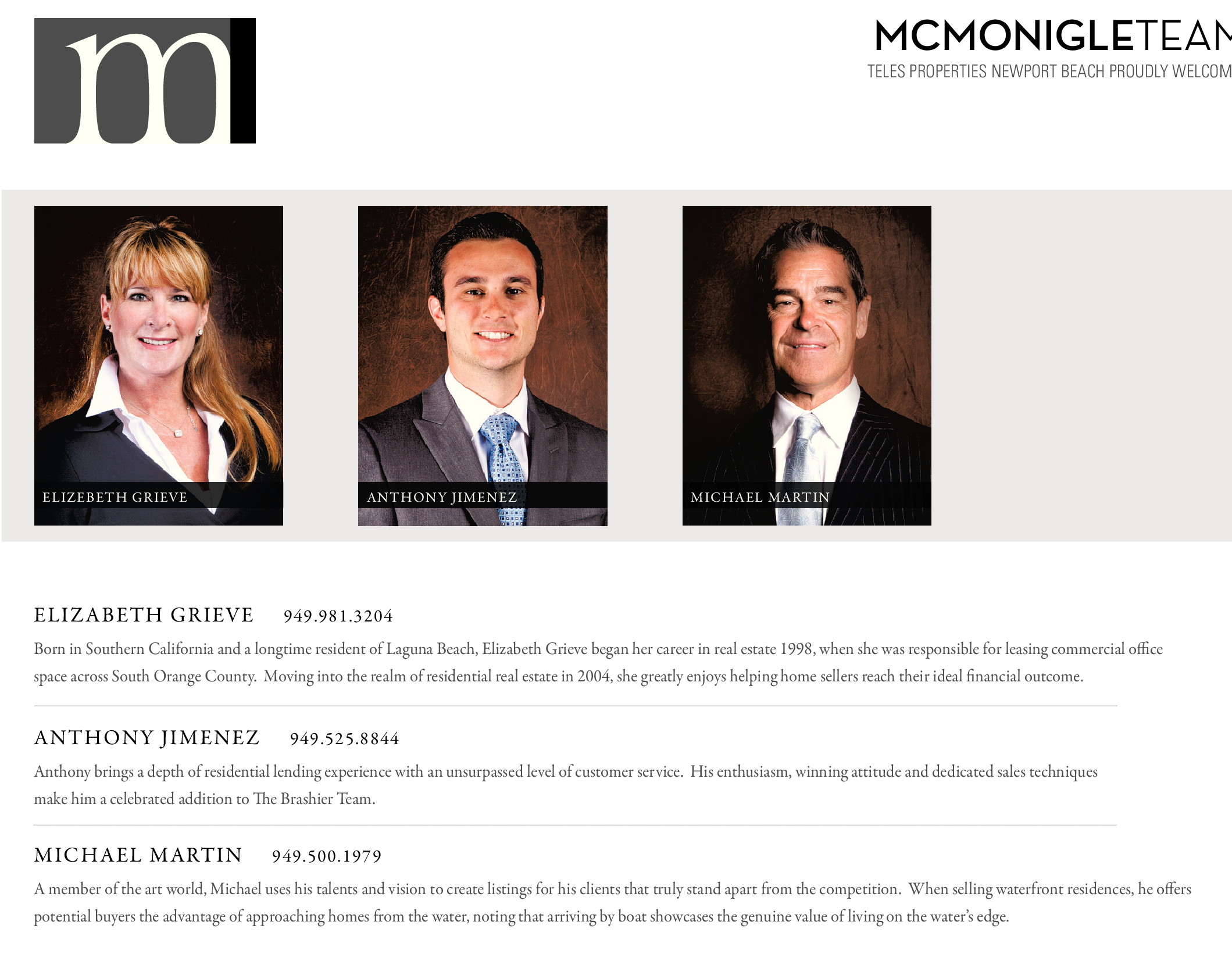 ELIZEBETH GRIEVE ELIZABETH GRIEVE 949.981.3204 MICHAEL MARTIN 949.500.1979 ANTHONY JIMENEZ MICHAEL MARTIN MCMONIGLETEAM TELES PROPERTIES NEWPORT BEACH PROUDLY WELCOMES Born in Southern California and a longtime resident of Laguna Beach, Elizabeth Grieve began her career in real estate 1998, when she was responsible for leasing commercial office space across South Orange County. Moving into the realm of residential real estate in 2004, she greatly enjoys helping home sellers reach their ideal financial outcome. ANTHONY JIMENEZ 949.525.8844 Anthony brings a depth of residential lending experience with an unsurpassed level of customer service. His enthusiasm, winning attitude and dedicated sales techniques make him a celebrated addition to The Brashier Team. A member of the art world, Michael uses his talents and vision to create listings for his clients that truly stand apart from the competition. When selling waterfront residences, he offers potential buyers the advantage of approaching homes from the water, noting that arriving by boat showcases the genuine value of living on the water’s edge.