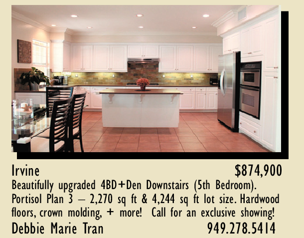 Irvine $874,900 Beautifully upgraded 4BD+Den Downstairs (5th Bedroom). Portisol Plan 3 – 2,270 sq ft & 4,244 sq ft lot size. Hardwood floors, crown molding, + more! Call for an exclusive showing! Debbie Marie Tran 949.278.5414