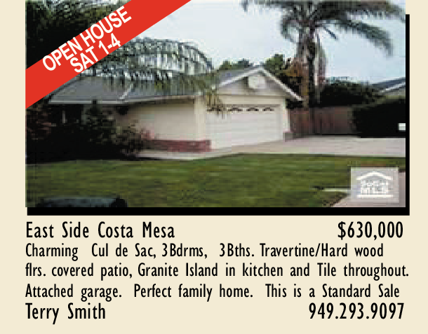 East Side Costa Mesa $630,000 Charming Cul de Sac, 3Bdrms, 3Bths. Travertine/Hard wood flrs. covered patio, Granite Island in kitchen and Tile throughout. Attached garage. Perfect family home. This is a Standard Sale Terry Smith 949.293.9097
