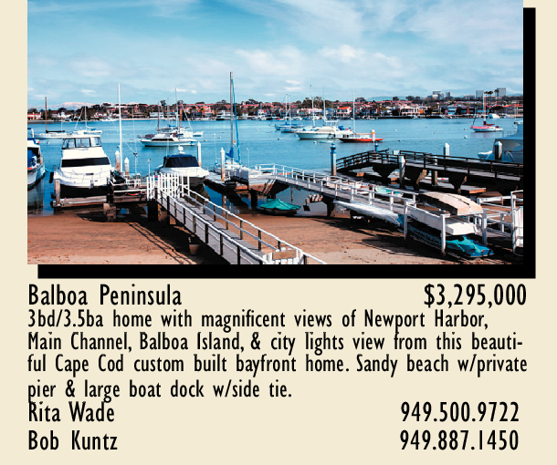 Balboa Peninsula $3,295,000 3bd/3.5ba home with magnificent views of Newport Harbor, Main Channel, Balboa Island, & city lights view from this beauti- ful Cape Cod custom built bayfront home. Sandy beach w/private pier & large boat dock w/side tie. Rita Wade 949.500.9722 Bob Kuntz 949.887.1450