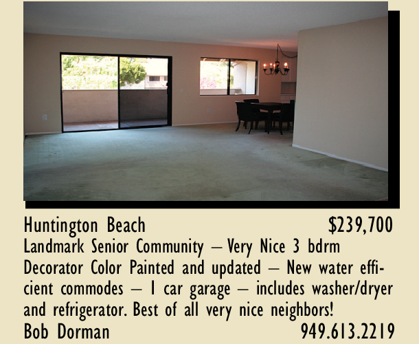 Huntington Beach $239,700 Landmark Senior Community – Very Nice 3 bdrm Decorator Color Painted and updated – New water efficient commodes – 1 car garage – includes washer/dryer and refrigerator. Best of all very nice neighbors! Bob Dorman 949.613.2219