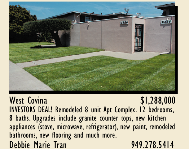 West Covina $1,288,000 INVESTORS DEAL! Remodeled 8 unit Apt Complex. 12 bedrooms, 8 baths. Upgrades include granite counter tops, new kitchen appliances (stove, microwave, refrigerator), new paint, remodeled bathrooms, new flooring and much more. Debbie Marie Tran 949.278.5414