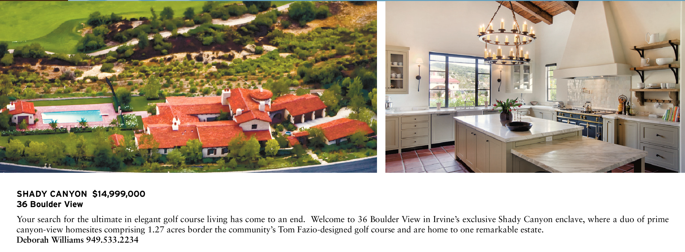 SHADY CANYON $14,999,000 36 Boulder View Your search for the ultimate in elegant golf course living has come to an end. Welcome to 36 Boulder View in Irvine’s exclusive Shady Canyon enclave, where a duo of prime canyon-view homesites comprising 1.27 acres border the community’s Tom Fazio-designed golf course and are home to one remarkable estate. Deborah Williams 949.533.2234