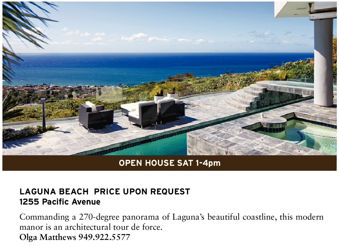 LAGUNA BEACH PRICE UPON REQUEST 1255 Pacific Avenue Commanding a 270-degree panorama of Laguna’s beautiful coastline, this modern manor is an architectural tour de force. Olga Matthews 949.922.5577