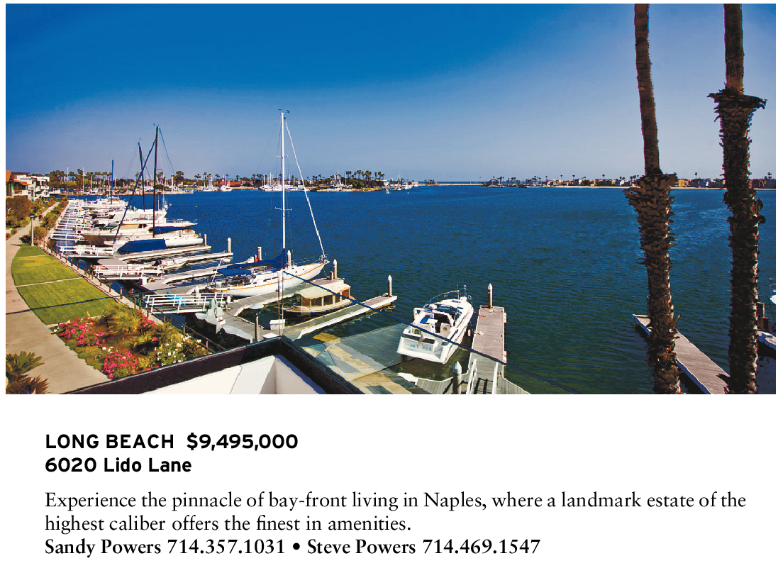 LONG BEACH $9,495,000 6020 Lido Lane Experience the pinnacle of bay-front living in Naples, where a landmark estate of the highest caliber offers the finest in amenities. Sandy Powers 714.357.1031 • Steve Powers 714.469.1547