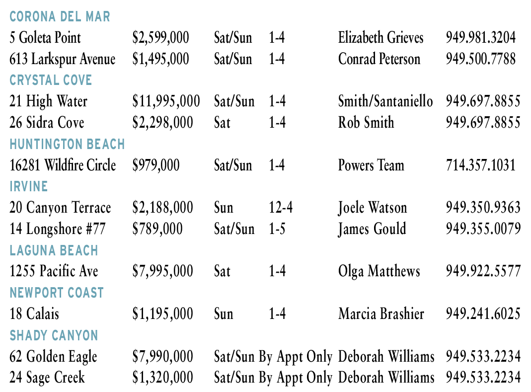 CORONA DEL MAR 5 Goleta Point $2,599,000 Sat/Sun 1-4 Elizabeth Grieves 949.981.3204 613 Larkspur Avenue $1,495,000 Sat/Sun 1-4 Conrad Peterson 949.500.7788 CRYSTAL COVE 21 High Water $11,995,000 Sat/Sun 1-4 Smith/Santaniello 949.697.8855 26 Sidra Cove $2,298,000 Sat 1-4 Rob Smith 949.697.8855 HUNTINGTON BEACH 16281 Wildfire Circle $979,000 Sat/Sun 1-4 Powers Team 714.357.1031 IRVINE 20 Canyon Terrace $2,188,000 Sun 12-4 Joele Watson 949.350.9363 14 Longshore #77 $789,000 Sat/Sun 1-5 James Gould 949.355.0079 LAGUNA BEACH 1255 Pacific Ave $7,995,000 Sat 1-4 Olga Matthews 949.922.5577 NEWPORT COAST 18 Calais $1,195,000 Sun 1-4 Marcia Brashier 949.241.6025 SHADY CANYON 62 Golden Eagle $7,990,000 Sat/Sun By Appt Only Deborah Williams 949.533.2234 24 Sage Creek $1,320,000 Sat/Sun By Appt Only Deborah Williams 949.533.2234
