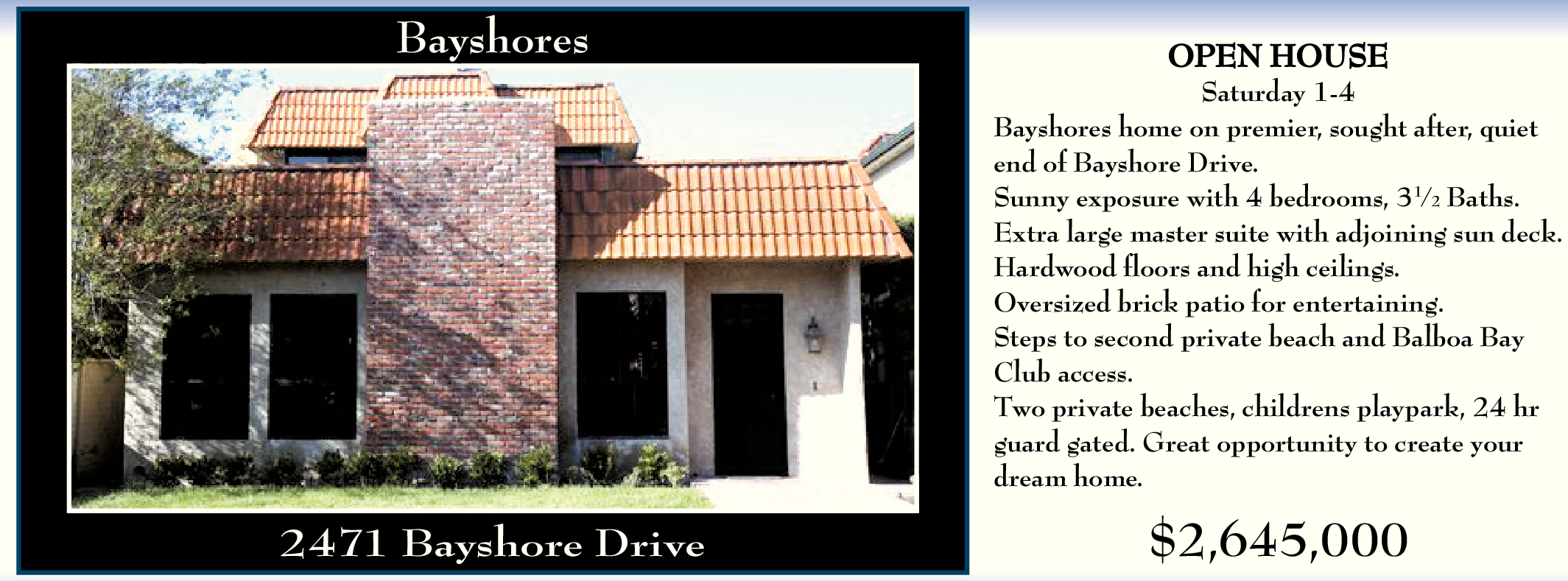 Bayshores 2471 Bayshore Drive OPEN HOUSE Saturday 1-4 Bayshores home on premier, sought after, quiet end of Bayshore Drive. Sunny exposure with 4 bedrooms, 3 1 ⁄2 Baths. Extra large master suite with adjoining sun deck. Hardwood floors and high ceilings. Oversized brick patio for entertaining. Steps to second private beach and Balboa Bay Club access. Two private beaches, childrens playpark, 24 hr guard gated. Great opportunity to create your dream home. $2,645,000