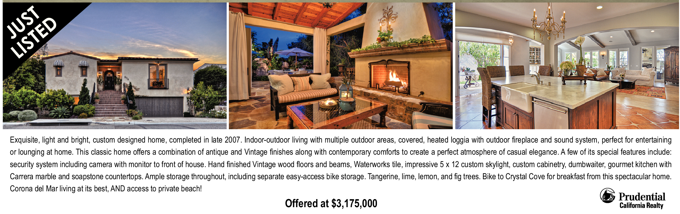 Exquisite, light and bright, custom designed home, completed in late 2007. Indoor-outdoor living with multiple outdoor areas, covered, heated loggia with outdoor fireplace and sound system, perfect for entertaining or lounging at home. This classic home offers a combination of antique and Vintage finishes along with contemporary comforts to create a perfect atmosphere of casual elegance. A few of its special features include: security system including camera with monitor to front of house. Hand finished Vintage wood floors and beams, Waterworks tile, impressive 5 x 12 custom skylight, custom cabinetry, dumbwaiter, gourmet kitchen with Carrera marble and soapstone countertops. Ample storage throughout, including separate easy-access bike storage. Tangerine, lime, lemon, and fig trees. Bike to Crystal Cove for breakfast from this spectacular home. Corona del Mar living at its best, AND access to private beach!