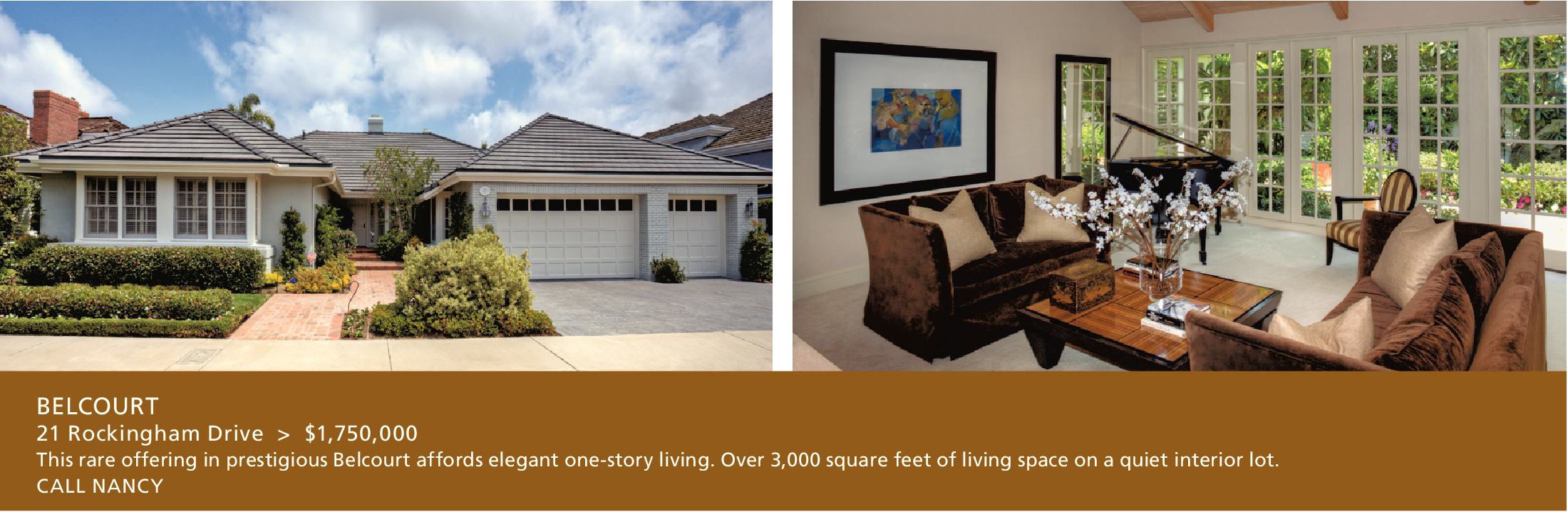 BELCOURT 21 Rockingham Drive > $1,750,000 This rare offering in prestigious Belcourt affords elegant one-story living. Over 3,000 square feet of living space on a quiet interior lot. CALL NANCY