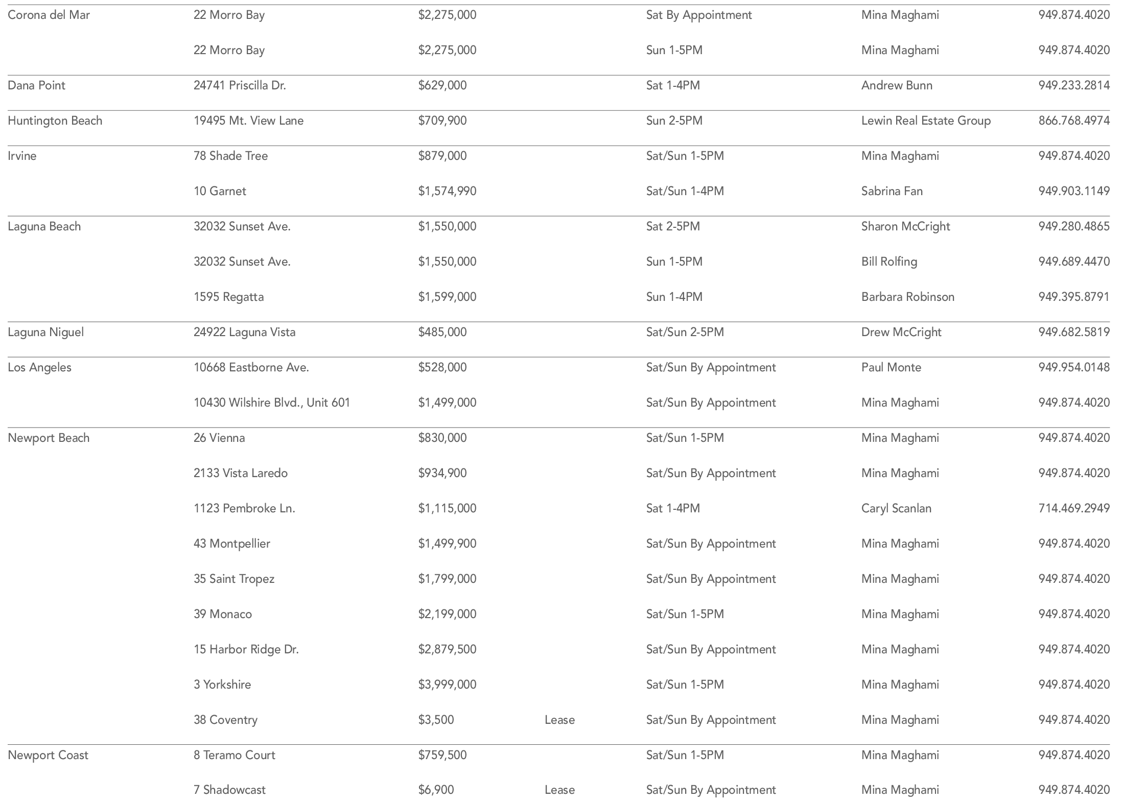 Corona del Mar 22 Morro Bay $2,275,000 Sat By Appointment Mina Maghami 949.874.4020