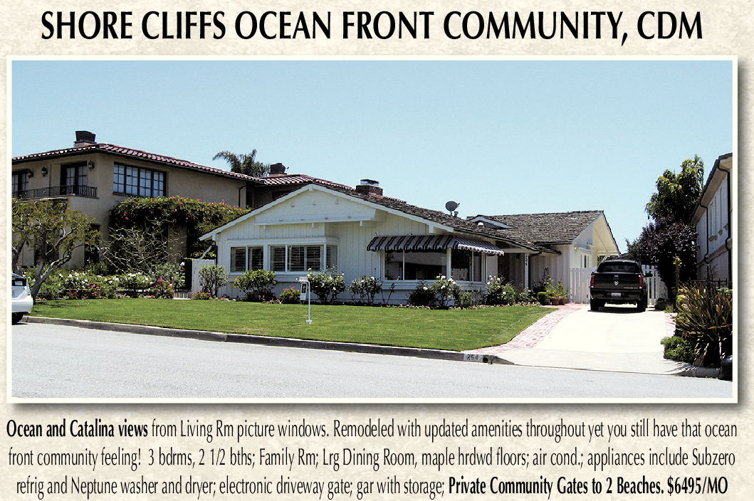 SHORE CLIFFS OCEAN FRONT COMMUNITY, CDM Ocean and Catalina views from Living Rm picture windows. Remodeled with updated amenities throughout yet you still have that ocean front community feeling! 3 bdrms, 2 1/2 bths; Family Rm; Lrg Dining Room, maple hrdwd floors; air cond.; appliances include Subzero refrig and Neptune washer and dryer; electronic driveway gate; gar with storage; Private Community Gates to 2 Beaches. $6495/MO