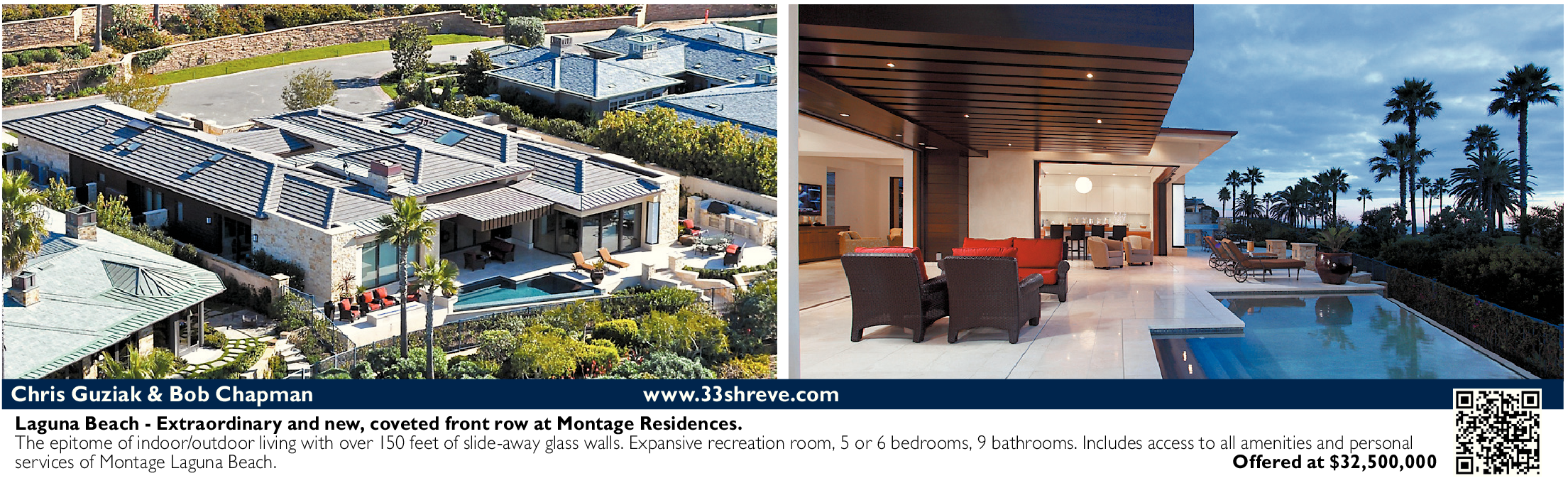 Chris Guziak & Bob Chapman www.33shreve.com Laguna Beach - Extraordinary and new, coveted front row at Montage Residences. The epitome of indoor/outdoor living with over 150 feet of slide-away glass walls. Expansive recreation room, 5 or 6 bedrooms, 9 bathrooms. Includes access to all amenities and personal services of Montage Laguna Beach. Offered at $32,500,000
